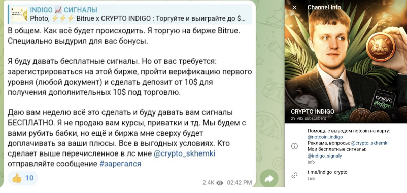 На 18 ноября 2024-го года ТГ-канал Indigo Crypto уже не существует. По соответствующему адресу в Телеграмм присутствует какой-то странный аккаунт с 6-ю подписчиками.
