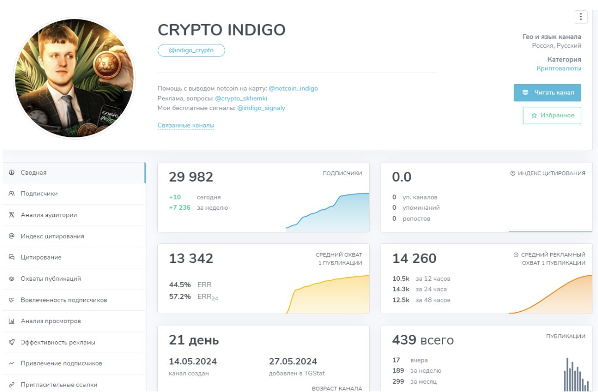 В сервисе аналитики сохранились данные о канале Indigo Crypto. Согласно им, на аккаунт было подписано около 30 тысяч пользователей. Каждую публикацию просматривали примерно 15 тысяч раз.