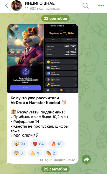 Crypto Indigo Hamster Kombat – проект трейдера, который на своем телеграмм-канале предлагал прибыльные торговые сигналы. Чтобы выяснить, насколько большим экспертом являлся этот инвестор, мы изучили сохранившуюся о нем информацию и поискали отзывы о его работе.