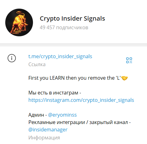 Crypto Insider Signal – телеграмм канал, созданный 10 февраля 2018 года. Посвящён тематике трейдинга и заработку на инвестициях. Основной канал является неким блогом, где автор публикует различного рода контент, связанный с криптовалютой.