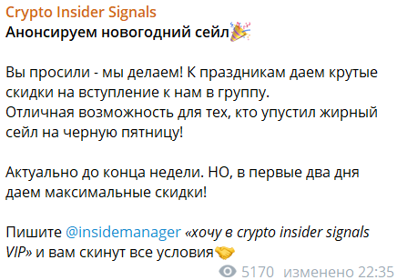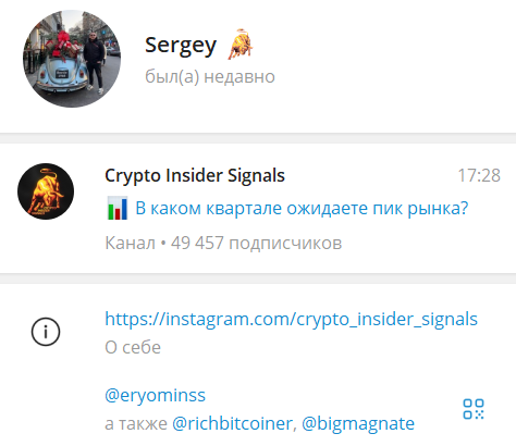 Владельцем канала Crypto Insider является – Сергей. Свою фамилию и конкретные данные скрывает. Имеет менеджера по рекламе, через которого также можно попасть в закрытую випку.