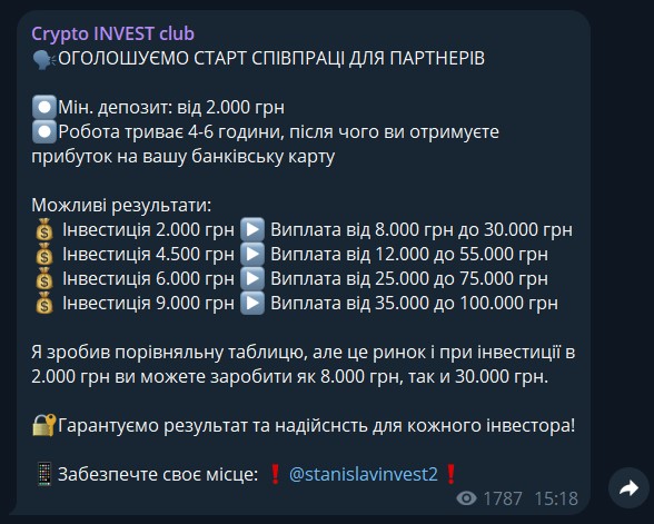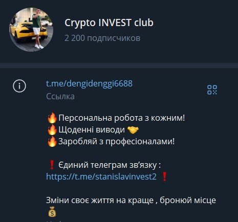 Crypto Invest club — Телеграм-канал, на котором предлагают раскрутку депозитов. Ориентирован на подписчиков из Украины, а его автор раздает обычные гарантии огромной прибыли без рисков. Рассмотрим, что собой на самом деле представляет канал и не опасно ли передавать деньги его владельцу.