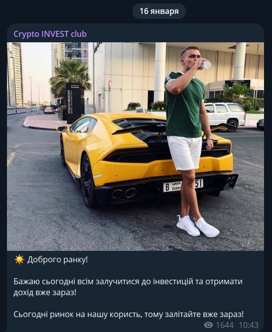Канал ведется на украинском языке, а ценник на раскрутку указывается в гривнах. Контент обычный для таких сообществ: посты с предложениями передать деньги на раскрутку разбавляются фотографиями с дорогими машинами, курортами, пачками денег и прочим, чем автор пытается показать свою успешность.