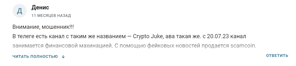 Негативные отзывы подтверждают, что доверять этому проекту не стоит. Заработать с каналом Crypto Juke вряд ли удастся. Трейдер рассчитывает на получение дохода от реферальных ссылок и продажи доступа к сомнительным материалам. Ему даже выгодно, если его клиенты сольют банк по его сигналам.