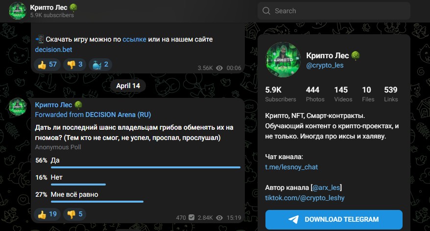 Телеграмм-канал «Крипто Лес» упорно выдает себя за комьюнити, где якобы помогают зарабатывать на самых горячих темах – NFT-токенах, аирдропах и криптовалютных играх. Анонимный автор проекта под псевдонимом Aleksei Leshy создает образ опытного проводника в этом сложном, но прибыльном мире. Лента сообщества наполнена новостями, аналитикой и, самое главное, «эксклюзивными» вариантами для заработка в сфере крипты.