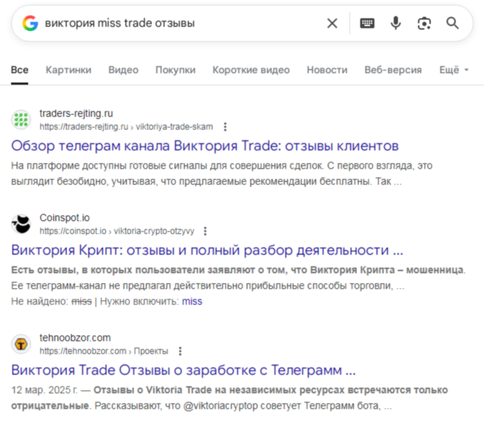 В интернете о проекте «Крипто Мисс Трейд» нет ни слова, что показывает его невостребованность. В сети нашлись статьи лишь о сообществах, которые схожи по концепции и управляются Викториями. Об авторе Виктория Miss Trade информации и отзывов в сети нет, что ставит под сомнение ее 10-ти летний стаж работы. Назвать девушку известной и авторитетной точно не получится