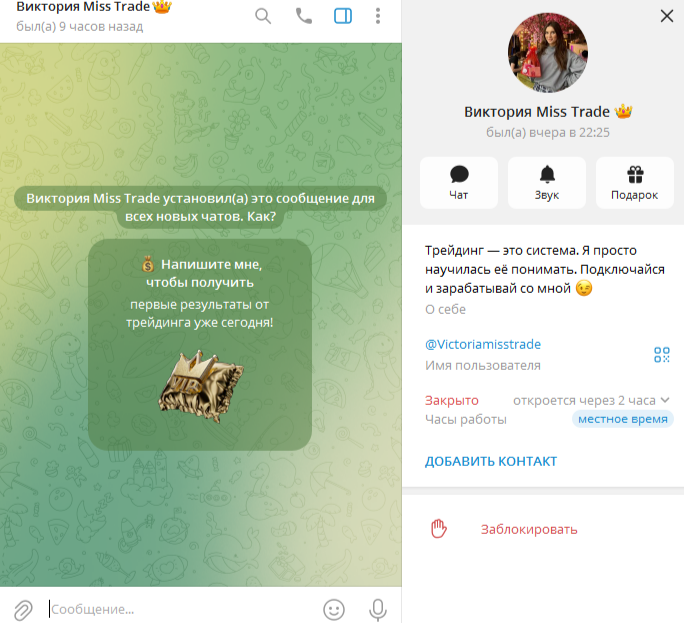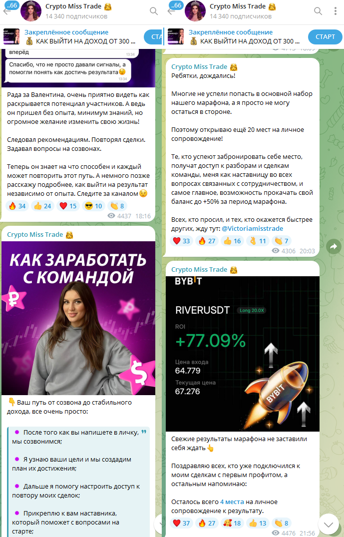 Crypto Miss Trade — телеграм-канал о заработке на трейдинге. Им управляет девушка, которая в данной сфере находится 10 лет. Она обещает, что поможет каждому выйти на высокий доход. При этом авторитетной личностью она не является.