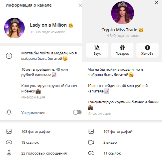 На просторах интернета мы обнаружили, что у канала Crypto Miss Trade есть клон. Его автором является некая Анна. У блогов одинаковое описание, плюс, схожие аватарки, сделанные в фотошопе.