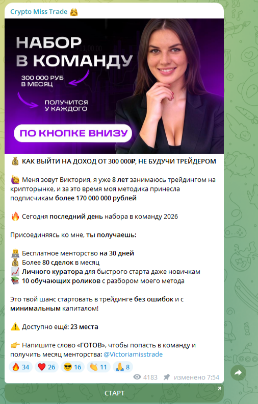 О платных услугах автора идет речь только в одной публикации на канале Crypto Miss Trade. Тут она предлагает присоединиться к своей команде, находясь в которой, каждый участник сможет выйти на заработок в 300 тысяч рублей в месяц. Отзывов от уже вступивших людей о Виктории Miss Trade нет.