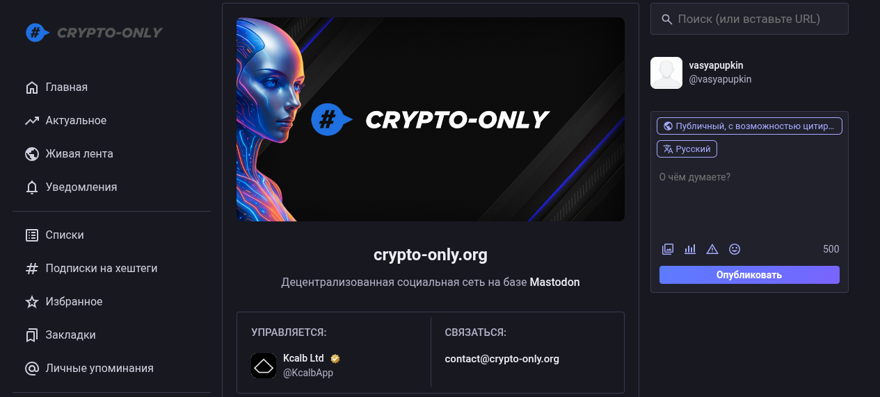 Сейчас портал Crypto-Only Org действительно работает в формате микроблога и визуально копирует стандартный функционал серверов Mastodon. На сайте есть живая лента публикаций, где можно писать комментарии, ставить лайки и делиться постами. Управляет текущей версией ресурса британская компания Kcalb Ltd. Попутно авторы Crypto Only хотят запустить широкую инфраструктуру Web3-продуктов: например, уже на подходе стартапы Xitcoin и InoAi.