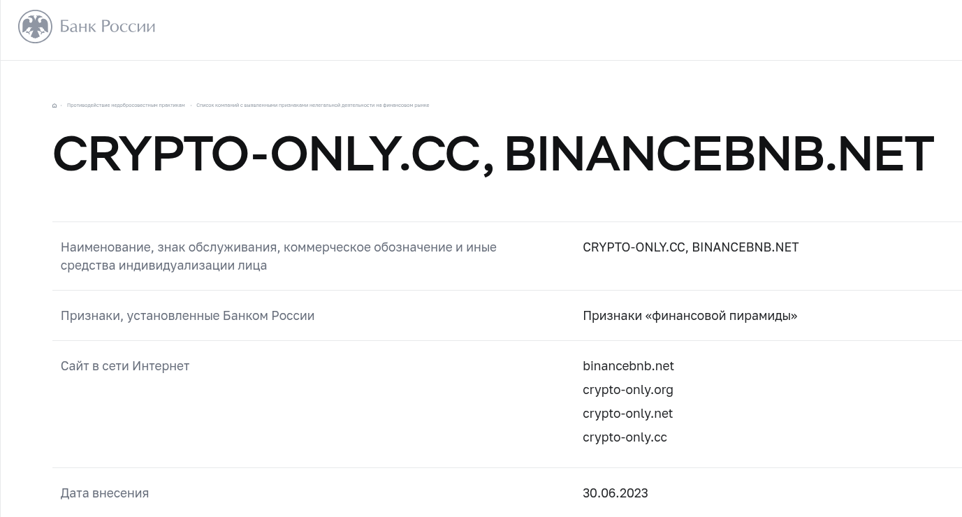 Темное прошлое домена и старые связи со скамерами полностью перечеркивают попытки создать честный имидж. Летом 2023 года по адресу Crypto-Only Org базировалась конкретная финансовая пирамида. Создатели конторы обещали прибыль до 550%, якобы начисляли дивиденды каждые 9 минут и предлагали реферальную программу с бонусами до 18%. Центробанк РФ быстро выявил обман, после чего внес ресурс в реестр компаний с признаками нелегальной деятельности. Независимые же расследования и вовсе показали, что площадка Crypto-Only Org входила в огромную сетку сайтов-клонов.