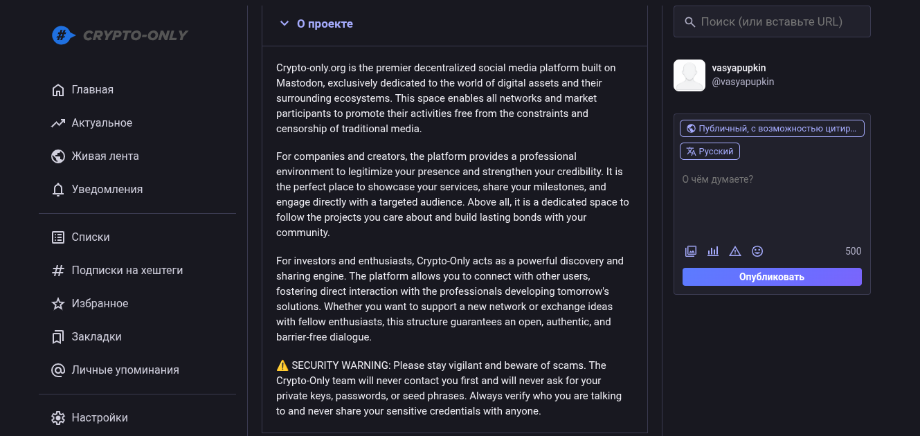 Сегодня сайт Crypto Only — якобы современная децентрализованная социальная сеть на базе протокола Mastodon. Сюда приглашают владельцев стартапов, инвесторов и разработчиков для безопасного делового общения. Создатели проекта обещают полную свободу слова без ограничений и навязчивой рекламы.
