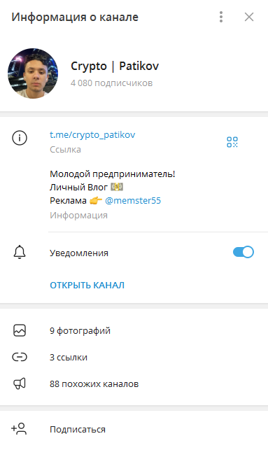 Crypto Patikov – ТГ канал о заработке на блокчейн-проектах и криптовалюте. Его основал молодой предприниматель, который делится инсайдерской информацией, секретами и стратегиями заработка. Мы провели независимую проверку канала. В этой статье расскажем, стоит ли доверять мнению этого трейдера или это развод.