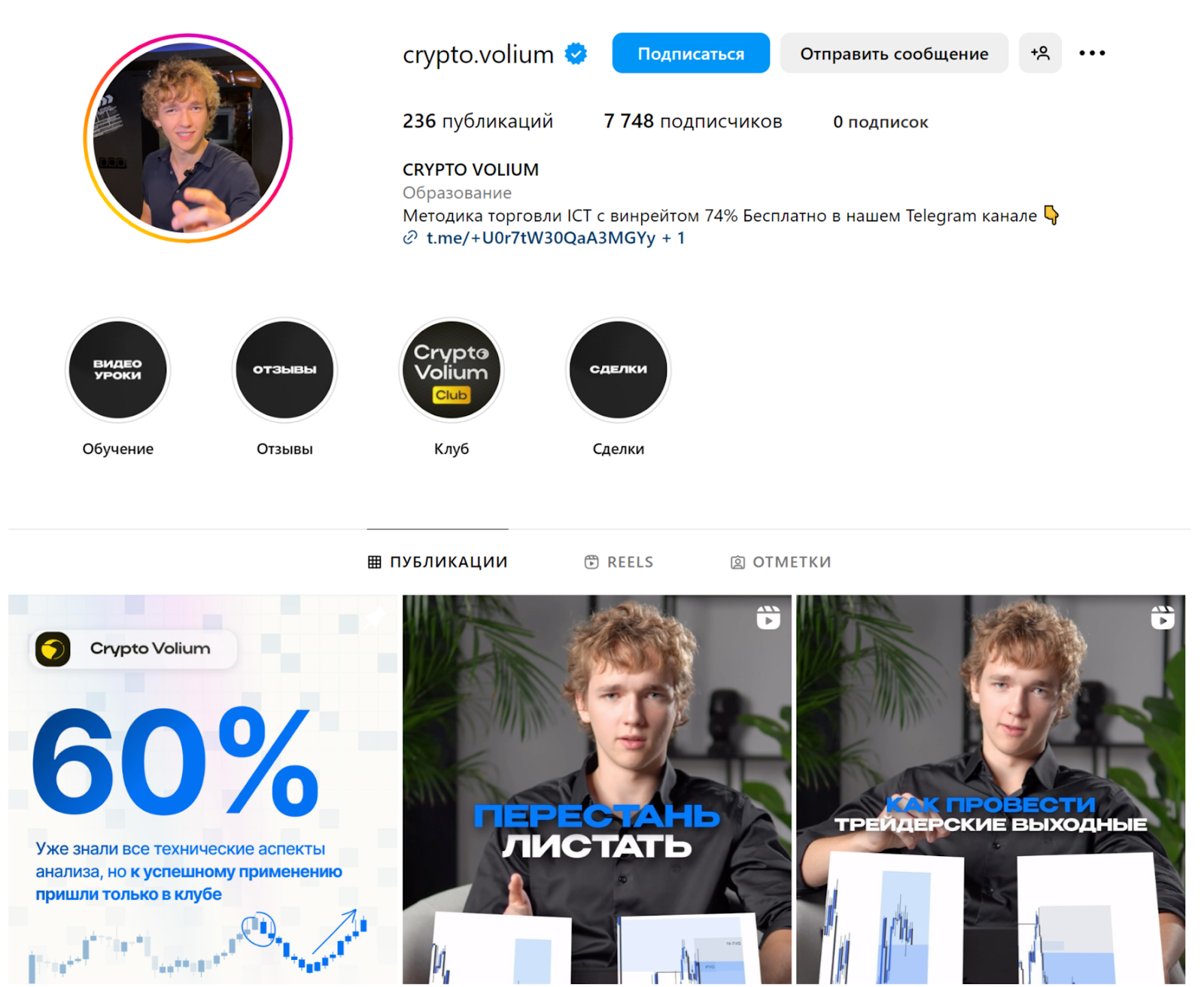 Кроме канала в Телеграм, автор открыл сообщества CryptoVolium и в других социальных сетях. К примеру, в Инстаграм к странице автора Crypto Volium подписано около 7.7 тыс. человек. В закрепленных историях приведены отзывы, условия обучения, сделки и советы по вступлению в клуб. Публикации посвящены теме трейдинга: ошибкам, ликвидности, правилам и т. д. Аналогичные материалы, но в формате видео, доступны и на Тик-Токе, где у трейдера около 13.5 тыс. подписчиков.