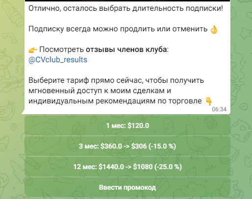 Стоимость вступления в клуб составляет 120 долларов. Для получения доступа можно нажать на кнопку вступления на официальном сайте или воспользоваться ботом в Телеграмме t me/CV_club_bot?start=club. После запуска последнего приводится инструкция по дальнейшим шагам: