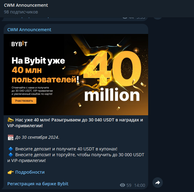 Разберем и дополнительные сообщества автора в социальных сетях. Существует также тг-канал с анонсами Cwmannounce, почты в нем посвящены обычно различным событиям на биржах. Цель проекта – зазвать на платформу по реферальной ссылке, а уже для этого используются эти анонсы различных якобы прибыльных мероприятий и акций.
