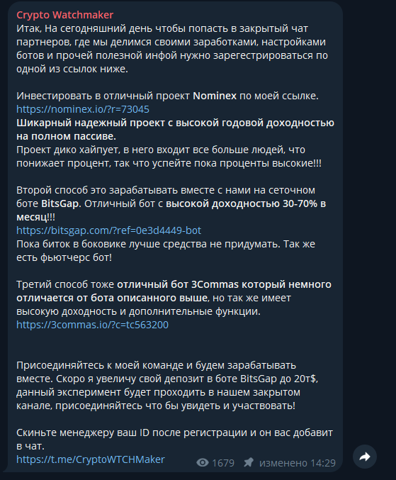 Проект Crypto Watchmaker публикует в соцсетях якобы полезный контент и параллельно продвигает свои “эффективные” услуги: доступ в приватное сообщество и обучение взаимодействию с роботами. Однако все заявления инвестора находятся под сомнением из-за следующих фактов: