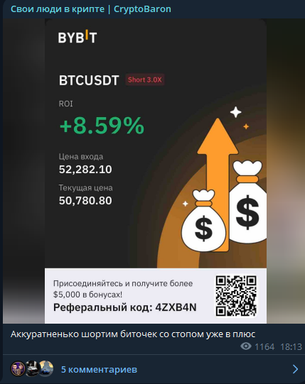 На сайте Криптобарона детально описаны услуги, а также есть политика конфиденциальности и договор оферты.В Телеграм-канале Свои люди в крипте CryptoBaron постоянно рекламируются различные криптовалютные стартапы и обменники. Также трейдер пирит биржу Bibyt. Это еще один источник заработка финансиста. Подобные посты сопровождаются реферальными ссылками.