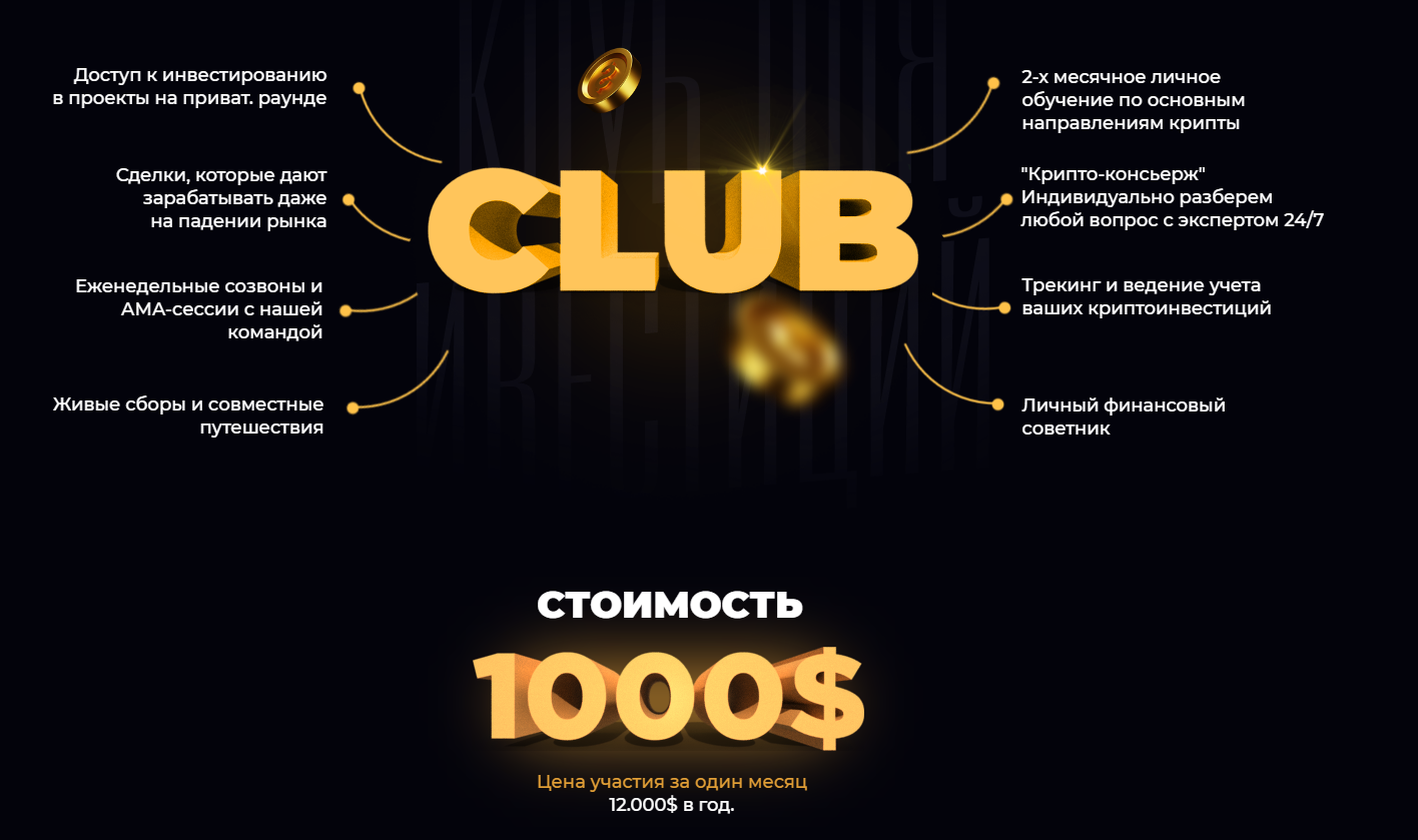 Клуб Криптобарон, стоимость доступа – 1000 долларов в месяц. В рамках клуба участники получают доступ к инвестиционным сделкам, еженедельным вебинарам и AMA-сессиям. Также участники этого сообщества получали доступ к личному финансовому советнику и круглосуточной службе поддержки.