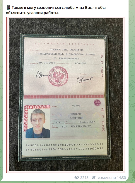 Чтобы убедить подписчиков Cryptogurud в Телеграме в своей надежности, трейдер публикует фотографию паспорта. Этот шаблон давно используют мошенники, просто меняя фотографию и ФИО на главной странице. Но Дмитрий Ионов не стал даже это делать. Он оставил ФИО Дмитрий Орлов. Ни один реальный трейдер не будет что-либо гарантировать, подтверждая это личными документами.