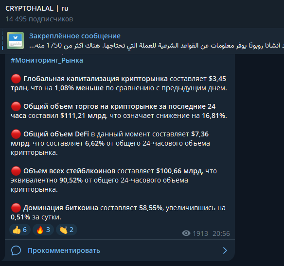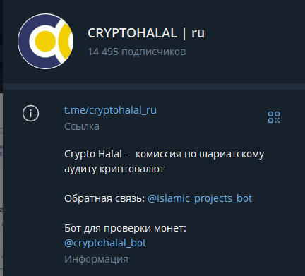 В телеграм-канале CRYPTOHALAL ru почти 14,5 тыс. подписчиков. Создатели ресурса называют себя комиссией по шариатскому аудиту криптовалют, однако кажется, что слово “комиссия” здесь используется, чтобы придать сообществу большей важности – на деле оно не особо подходит под формат проекта. В описании также есть ссылка на некий бот для проверки монет.