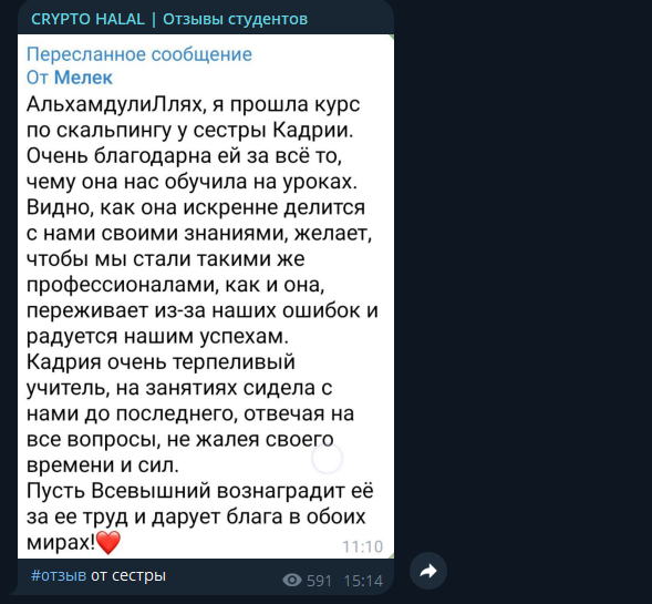 Для отзывов у CryptoHalal тоже есть отдельный канал, но их содержание довольно спорно. То, что здесь будет размещаться только позитив – и так очевидно, но это не единственная проблема. Если почитать несколько комментариев людей, то каких-то объективных плюсов за $620 особо и нет. Часто трейдеры на протяжении всего сообщения просто хвалят преподавателя: его искренность, терпеливость и стремление помочь. Это, конечно, плюс, но хотелось бы узнать что-то именно о трейдинге и конечных результатах, а не о личных качествах экспертов.
