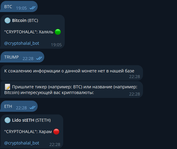 Приложение в Telegram под названием Проверка криптомонет определяет, является ли токен дозволенным в исламе, или же нет. Тяжело определить, насколько люди, занимающиеся этим, объективны и на что они вообще опираются. Однако эффективность программы очень спорная. Результат по биткоину он, конечно, без проблем выдал, но далее начались неполадки. Монета $TRUMP, например, недавно была очень популярна, но сюда ее так и не добавили, поэтому некоторые могли упустить шанс заработать на ней, ожидая появления в боте. Не нашелся и почему-то очень известный токен $ETH, зато вместо него выдается некий $TETH, о котором знают гораздо меньше людей.