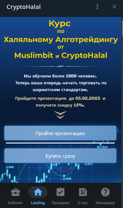 Многие публикации посвящены Академии трейдинга Крипто Халяль. Ознакомиться с информацией о ней и купить доступ можно через веб-приложение в Telegram. Здесь пользователя сразу встречает ничем не подтвержденное заявление о завершении обучения более 1 тыс. человек. После просмотра начальной презентации всем выдают скидку 15%, поэтому игнорировать это при покупке не стоит.