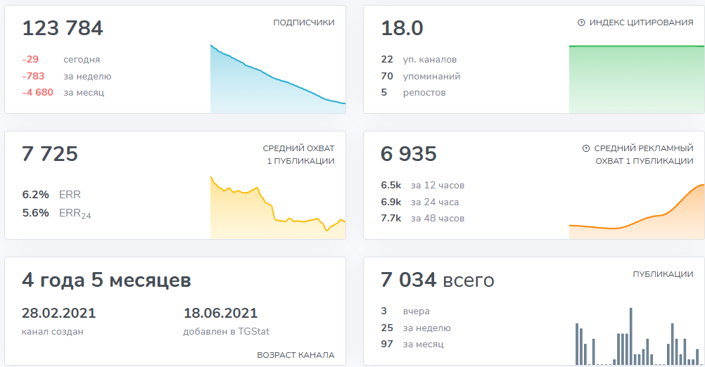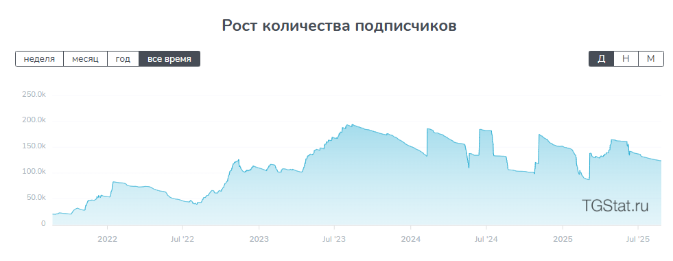 На канал подписано 120 тысяч человек. Однако при ближайшем рассмотрении статистика начинает трещать по швам. График подписчиков скачет, как кардиограмма, а посты читают в среднем 7-8 тысяч человек. Это капля в море для такого гиганта. Все это сильно напоминает накрутку аудитории для создания видимости, будто проект очень известный.