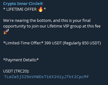 CIC Alex часто советует торговать с плечом 4Х, выделяя на каждую сделку 3-5% от капитала. А чтобы у подписчиков не было сомнений, канал завален скриншотами успешных сделок. Прибыль в 116%, 156% – такие цифры должны сносить голову новичкам. Вот только проверить, была ли настоящая прибыль, невозможно. Это просто картинки без доказательств.Основной метод заработка автора – это, конечно же, платный VIP-клуб. Стоимость кусается: месячная подписка обойдется в 99-175 долларов в USDT. Есть и пожизненный доступ за 850 USDT, который постоянно предлагают покупать со скидкой. Система оплаты – отдельная история. Деньги нужно отправлять напрямую на криптокошелек. Такой перевод нельзя отменить или оспорить. Если что-то пойдет не так, ваши деньги просто исчезнут.