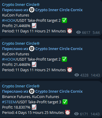 Лента канала в Telegram Crypto Inner Circle пестрит бесплатными сигналами. Все они выглядят очень профессионально: тикер монеты, точка входа, цели по прибыли и стоп-лосс.