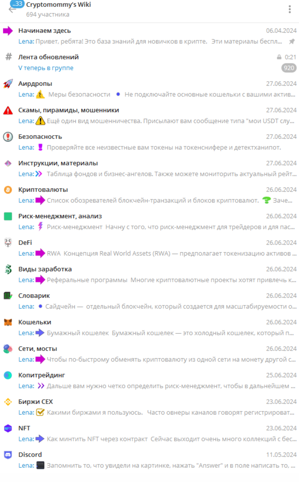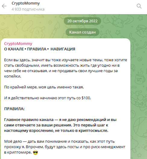 Телеграм-канал CryptoMommy создан в 2022 году. С первого дня здесь стали выходить экспертные и обучающие публикации. В приветственном сообщений Lena Lynch сразу делает пометку, что контент, который здесь будет появляться – не является рекомендацией и она не несет ответственность за действия подписчиков.