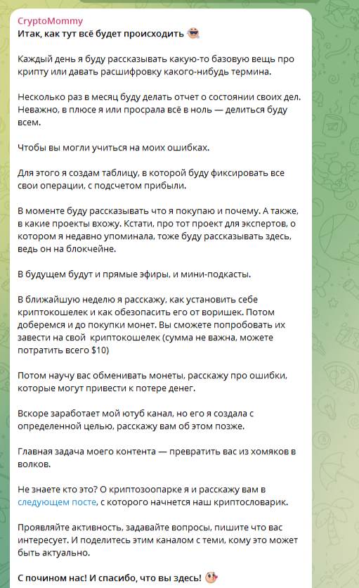 Стоит заметить, что первое сообщение на канале CryptoMommy знакомит нас только с самим проектом. Но о себе автор ничего не рассказывает. Нам удалось только узнать то, что она создала данный канал чтобы делиться своим путем в крипто-мире.