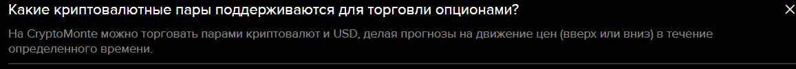 В FAQ написано про торговлю опционами на криптовалютные пары против доллара. Пользователи должны угадывать движение цен вверх или вниз за определенное время. Пополнить счет можно криптой и картами. Минимальная сумма депозита нигде не указана. Размеры комиссий тоже спрятаны от пользователей.