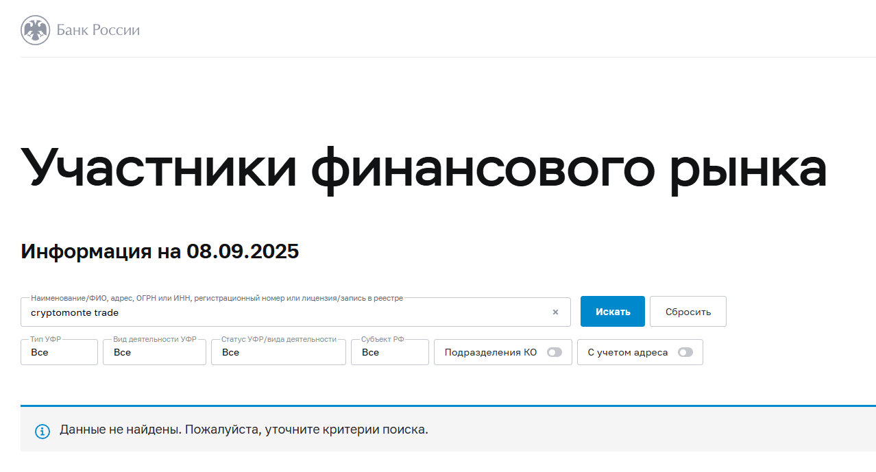 Полное отсутствие отзывов о cryptomonte trade крайне подозрительно. Любая финансовая платформа быстро обрастает отзывами. Положительными и отрицательными. Здесь информационный вакуум. Видимо реальных клиентов у них нет.
