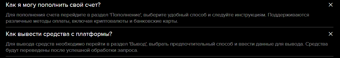Процесс вывода средств описан поверхностно. FAQ говорит только «перейти в раздел вывод и следовать инструкциям». Сроки обработки заявок неизвестны. Минимальная сумма для вывода не раскрывается.