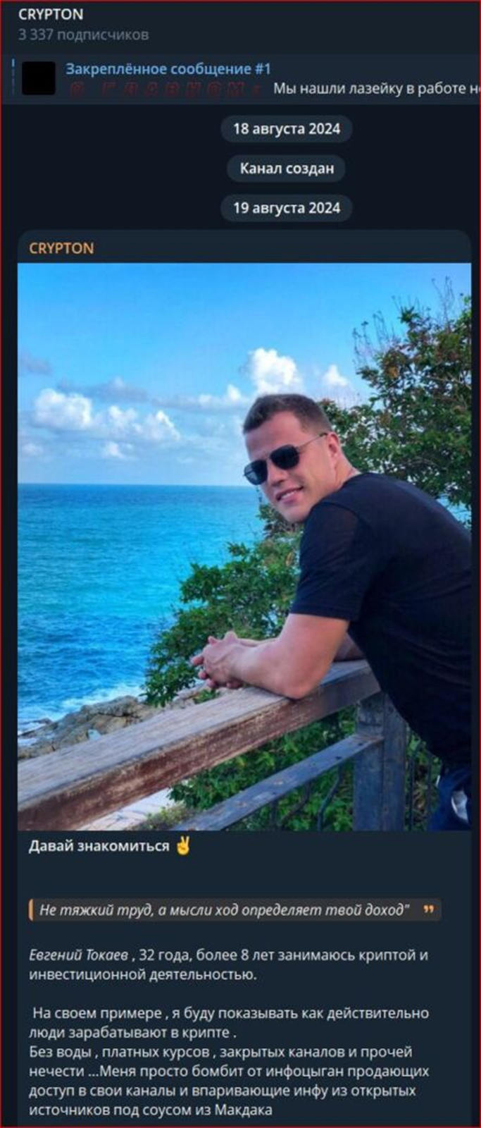 В ходе проверки трейдера выявлено, что он регулярно заводит дополнительные площадки. Встретился канал Tokaev Crypto, который по тематике и контенту напоминает «Криптон».