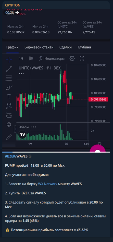 Телеграм «Криптон» предоставляет возможность пользователям поучаствовать в пампе криптовалют. Нужно зарегистрироваться, приобрести монету WAVES на проекте WX Network, а затем можно ждать оповещения на покупку/продажу токена. В реальности это Honeypot-токены, которые не продаются.