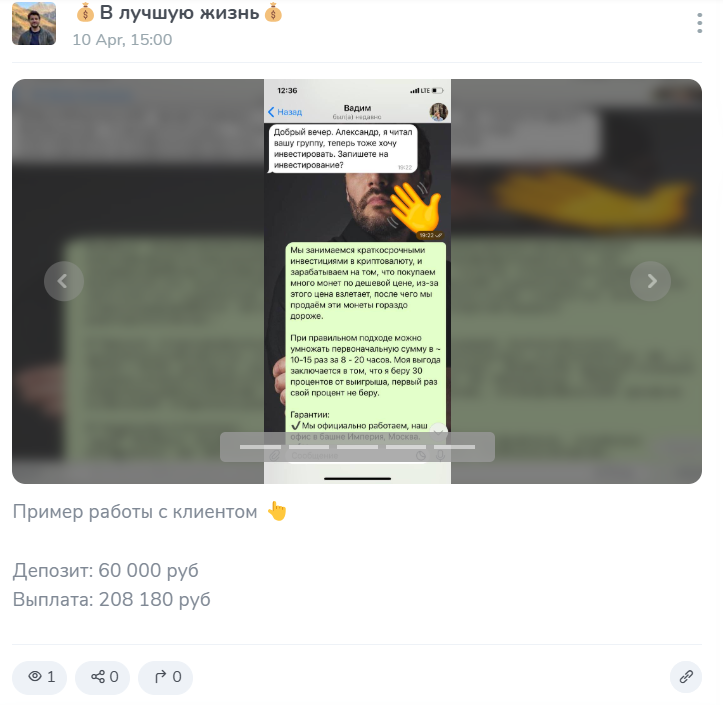 Создатель проекта пытается использовать психологическое давление и в посте за постом показывают, что мест на его обучение осталось всё меньше и меньше. Актуальные офферы на 10 апреля 2025 года следующие: тариф “Стандарт” – с инвестиций в 50 тыс. прибыль составляет от 340 тыс.; тариф “Премиум” – вклад в 100 тыс. руб. возвращается в сумме 1,6 млн. За свой труд трейдер берёт от 10 до 30% – всё зависит от вложенной суммы клиента. Если работа пройдёт без результатов, то он обещает полностью вернуть средства. В качестве гарантии представляются те же видео-фальшивки. Срок выполнения, то есть через какое время он вернёт умноженные инвестици, составляет примерно 12 часов. Указывается, что рисков для клиента нет абсолютно никаких – конечно, какие могут быть риски при пересылке денег неизвестному человеку в интернете, да ещё и в крипте.