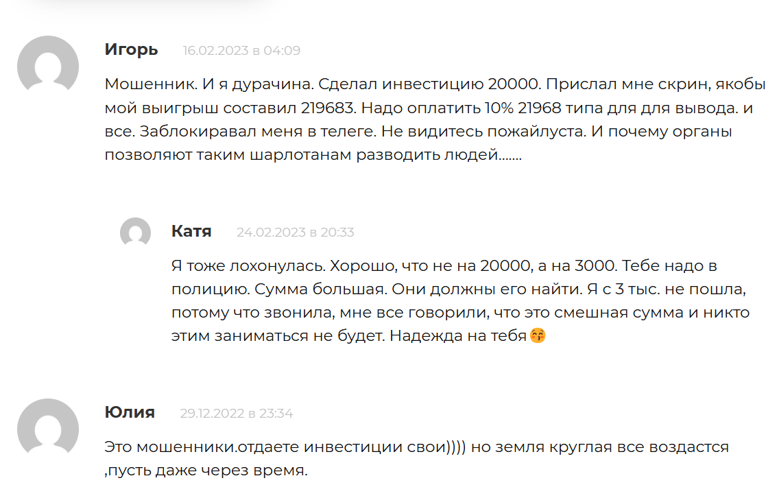 Отзывы о проекте Alex Invest исключительно негативные и подтверждают, что проект работает по схеме аферистов. Также юзеры упоминают, что Алекс ставит фото, которое некогда использовал в канале с аналогичным инвестиционным оффером Дмитрий Велинский, @ Mysmartinv – данный персонаж также имеет подмоченную репутацию. Второй этап обмана – требование перевести дополнительные выплаты, чтобы забрать свои “умноженные” миллионы.