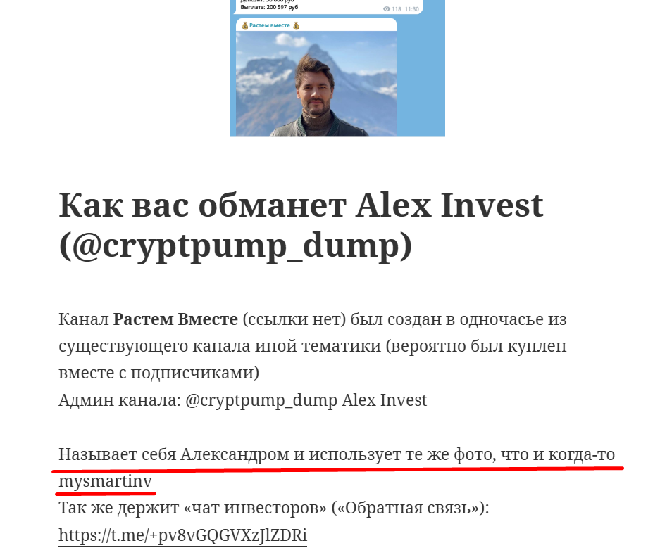 Алекс инвест – ещё одна маскировка для распространённой схемы обмана, в которой на сцене Телеграмм паблика перед подписчиками появляется успешный трейдер. Он обладает невероятно плохой памятью и всегда забывает рассказать о своём бэкграунде и показать статистику торговли, зато он (или она) смело заявляют, что несут деньги каждому, кто к ним обратиться. В результате сотрудничества пользователь теряет инвестиции, а также может перевести некоторые суммы “на налоги”.