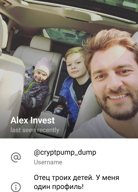 В каждом посте – откровенно сомнительный оффер об увеличении инвестиций пользователя, при этом сам “умножитель” о себе практически ничего не рассказывает. В профиле трейдера указано, что он отец троих детей – во-видимому, автор проекта считает данное заявление доказательством своей честности (или хочет организовать клуб родителей). Также он говорит о наличии одного профиля, якобы он такой популярный, что его аккаунт могут подделывать.