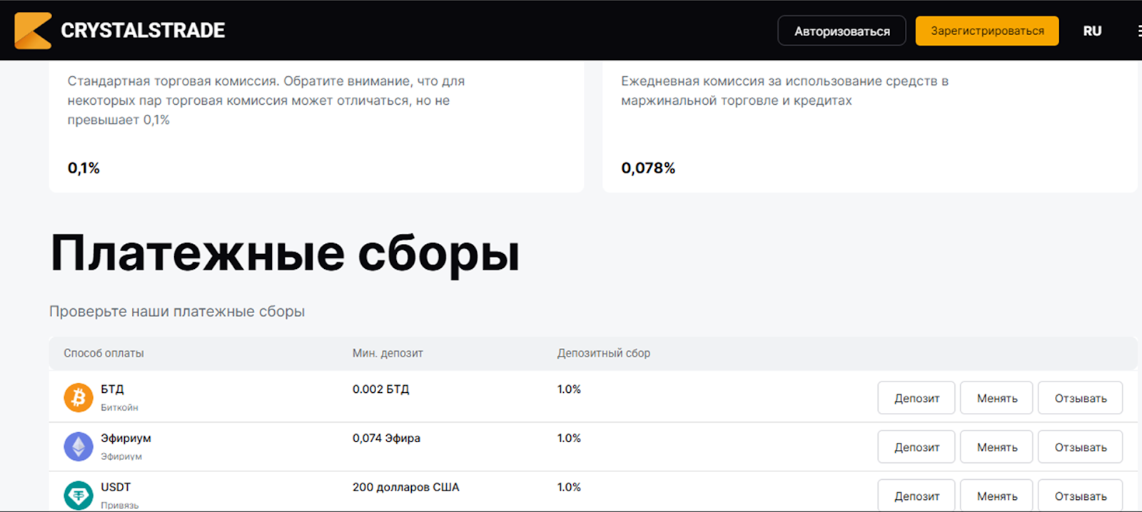 «Кристалс трейд» предлагает торговать более чем 200 валютными парами и тремя фиатными валютами. Трейдеры могут получить доступ к фьючерсному и спотовому рынкам. Стандартная торговая комиссия составляет 0,1% от суммы сделки.