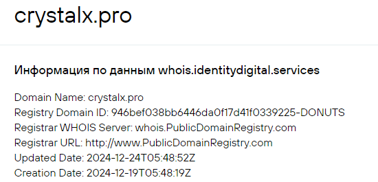 Анализ домена с помощью сервиса Whois показывает, что биржа очень молодая, сайт зарегистрирован лишь в декабре 2024 года.