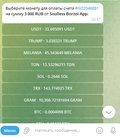Перевод средств через криптобота осуществляется в Telegram. В боте трейдерам доступен большой перечень криптовалют.