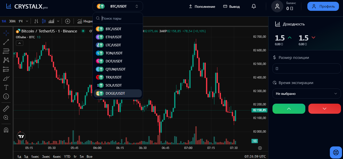 Можно торговать BTC/USDT, ETH/USDT, LTC/USDT, TON/USDT и другими популярными криптовалютными парами.
