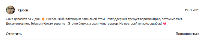 В этом отзыве трейдер под ником Quoon рассказывает, как биржа обокрала его на $200. Сначала потребовали пройти верификацию, а затем техподдержка перестала отвечать на запросы.
