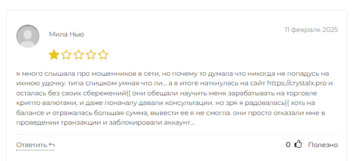 В интернете о бирже Crystalx Pro в основном негативные отзывы. Трейдер по имени Инга жалуется, что владельцы завлекают начинающих пользователей, а когда дело доходит до вывода прибыли, требуют заплатить какой-то налог. В итоге клиентка лишилась всех средств.