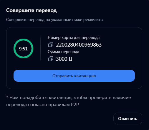 Если выбрать банковскую карту, откроется окно с предложением отправить деньги на указанные реквизиты. Минимальная сумма — 3000 руб.