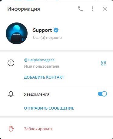 Связаться со специалистами можно только через Telegram. Обещают доступность специалистов в режиме 24/7, но на практике саппорт на запросы не отвечает.